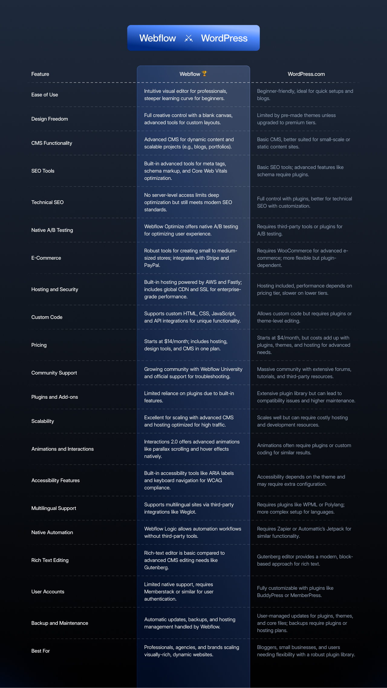 Backup and Maintenance | Automatic updates, backups, and hosting management handled by Webflow. | User-managed updates for plugins, themes, and core files; backups require plugins or hosting plans. |